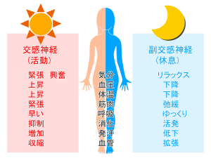 自律神経は、交感神経と副交感神経という逆の働きをする2つに分かれています。身体を活発に動かすときに働く交感神経と、身体を休めるときに働く副交感神経で互いにバランスを取りながら身体の状態を調節しています。